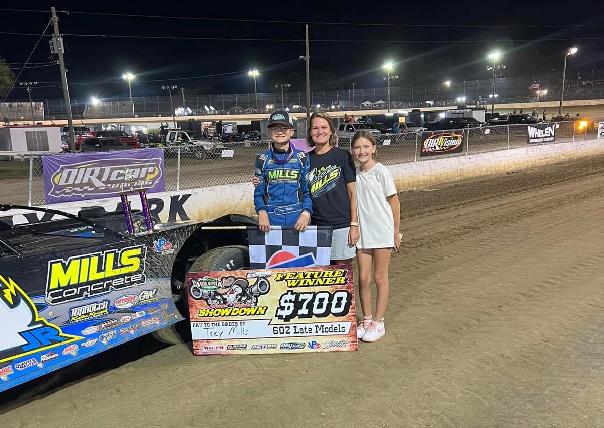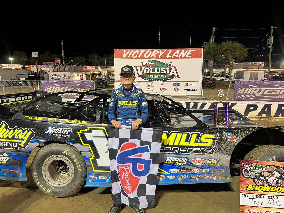 Pulling double duty in the 604 and 602 Crate Late Model ranks, Trey Mills visited Volusia Speedway Park (Barberville, Fla.) on Saturday afternoon aboard his Mills Concrete No. 14JR entries.
